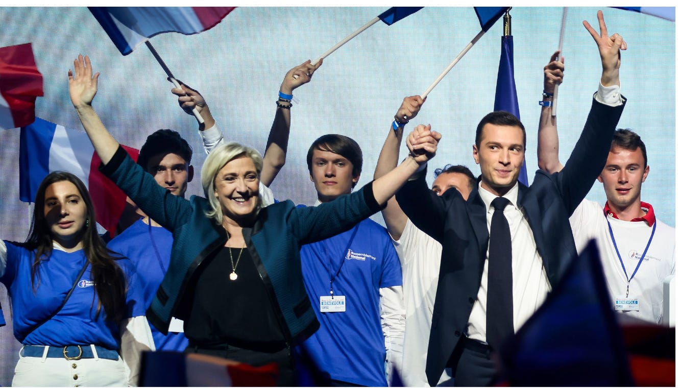 A National Rally majority, which could mean Bardella becomes Prime Minister, would complicate or even torpedo that. Bardella would likely become even more hardline if he gets that kind of power. Never forget that the original Fascism billed itself as a youth movement —the only movement able to save a degenerating and aging Europe.