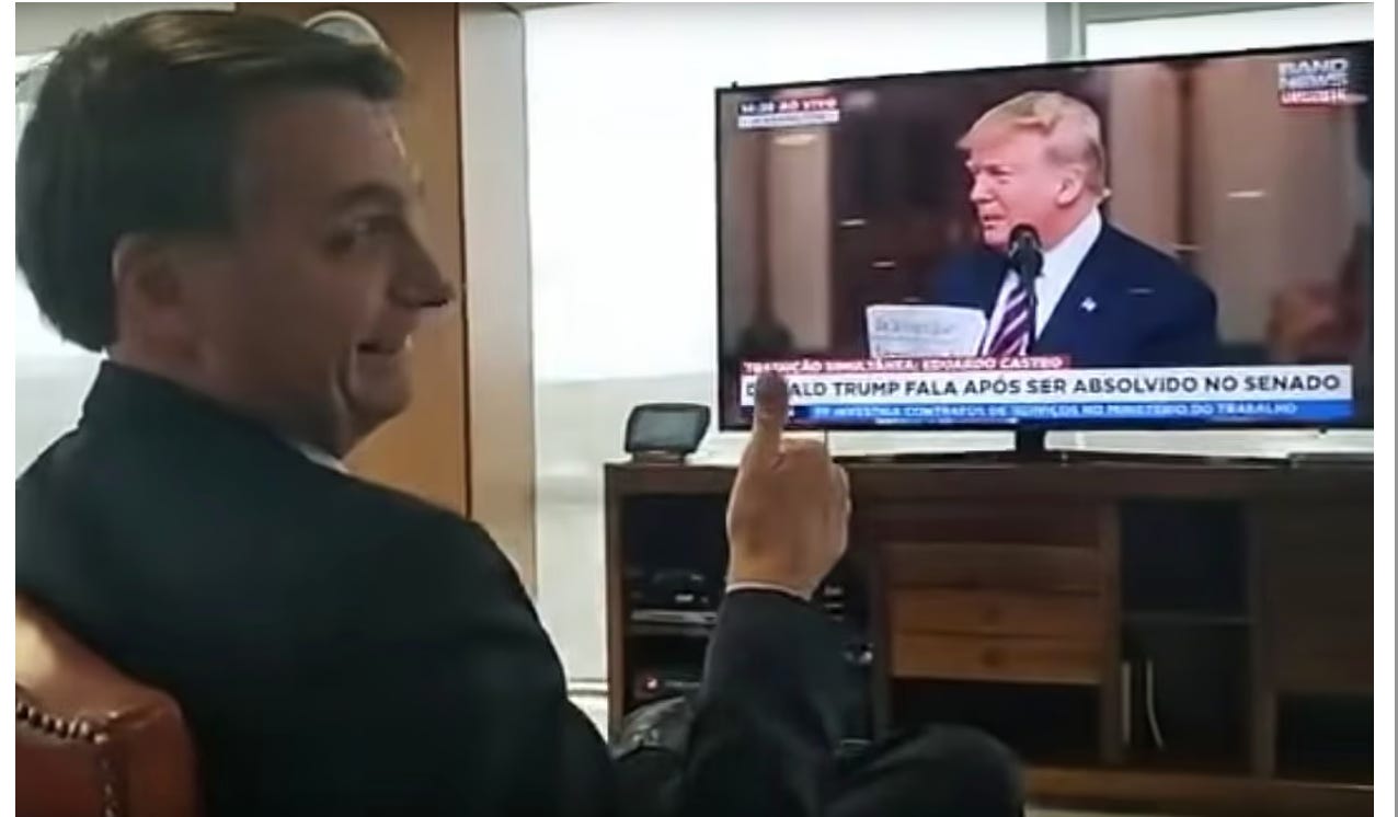 Bolsonaro had always flattered Trump by positioning himself as Trump’s biggest defender in Latin America. In February 2020, that meant putting on a sycophantic performance: livestreaming himself watching Trump celebrate his 2020 acquittal by the Senate in his impeachment trial.