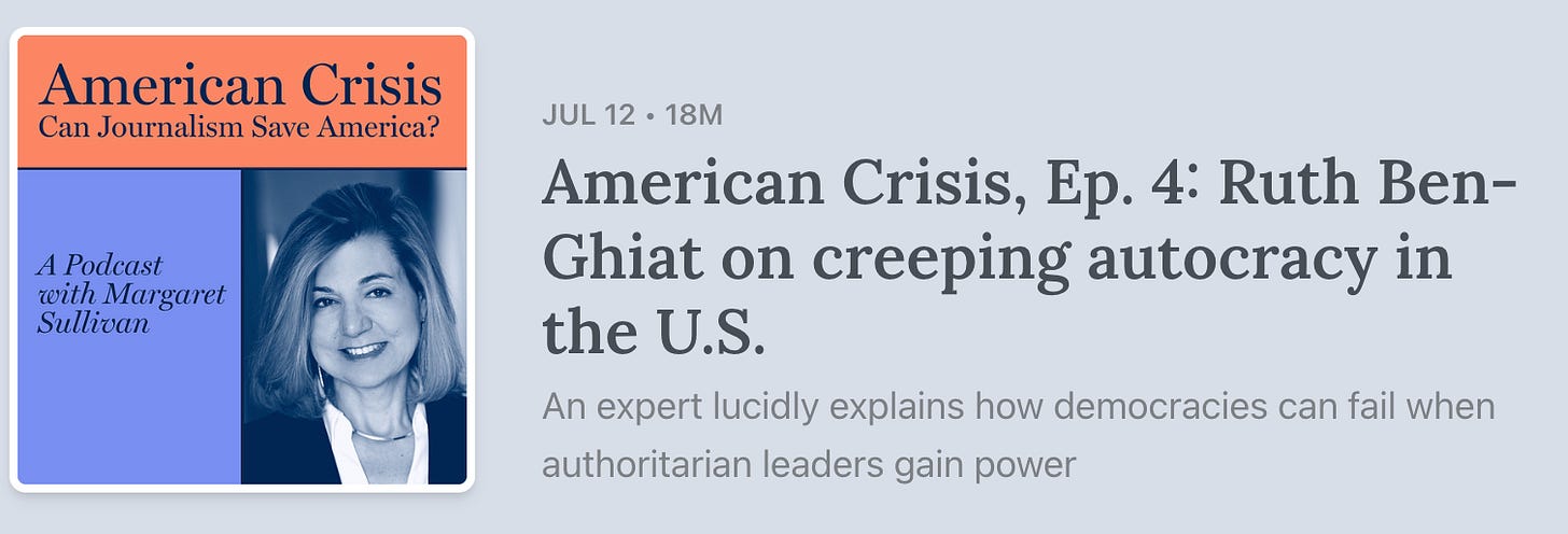 Margaret now writes a weekly column for the Guardian US, teaches at Duke University, and has a new Substack newsletter entitled American Crisis. It asks: Can Journalism Save Democracy? She interviewed me for her Substack’s podcast, and I’m very happy to share our conversation with you. “I have tremendous respect for Ben-Ghiat’s scholarship and her superb ability to educate journalists and citizens about the dangers of these autocratic figures. She’s also a lot of fun to talk to.” The feeling is mutual!