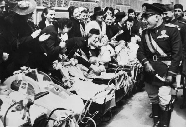 “Cradles are empty and cemeteries are expanding," he declared. "The entire White race, the Western race, could be submerged by other races of color that multiply with a rhythm unknown to our own.” A Fascist “Battle for Babies” followed, as did extensive social welfare assistance for new mothers, ceremonies for prolific procreators, bans on abortion and contraception, and a tax on bachelors over 25 years old.
