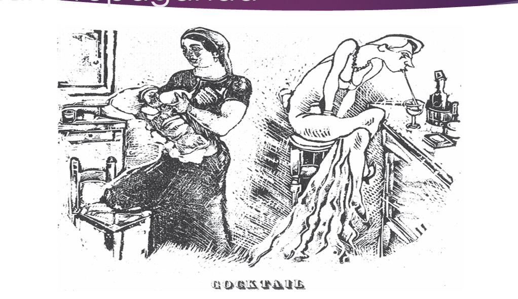 Vance and other contemporary American critics of “people without kids” and “childless” women carry forth attitudes that circulated during Fascism. This 1932 Fascist satirical drawing, ”Cocktail,” by Mino Maccari, compared the so-called “crisis woman,” to a good Italian woman giving milk to a baby. One grew the population, the other did not.