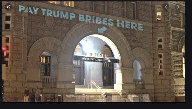 As happened in 2019 Baltimore and elsewhere, public protest and public art combined to make Trump's corruption and brutality visible. Robin Bell’s projections on the façade of Trump International Hotel in Washington stand out, like his May 2017 action, “Pay Trump Bribes Here,” that called attention to Trump's profiting from his private business concerns.