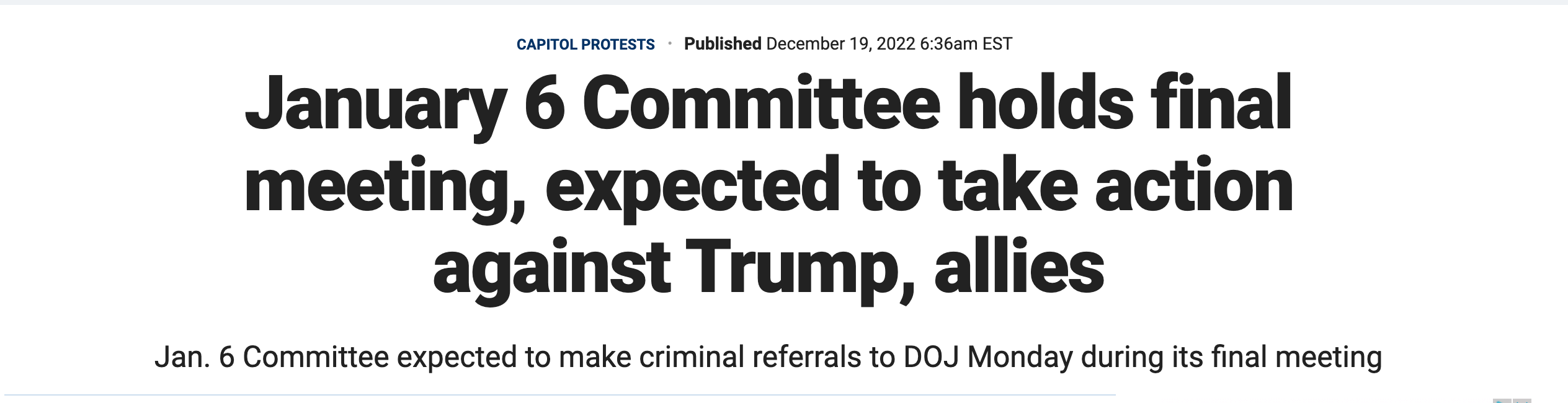 As reported by Politico, the committee is expected to make several criminal referrals to the Department of Justice regarding former president Donald Trump. They could be: inciting insurrection, obstructing an official proceeding, and conspiracy to defraud the U.S. government.