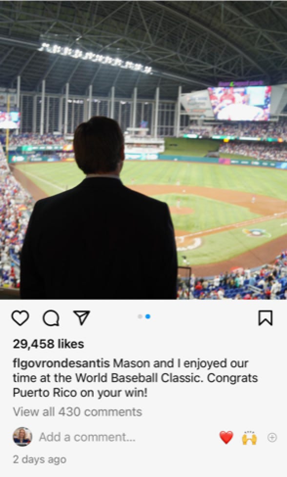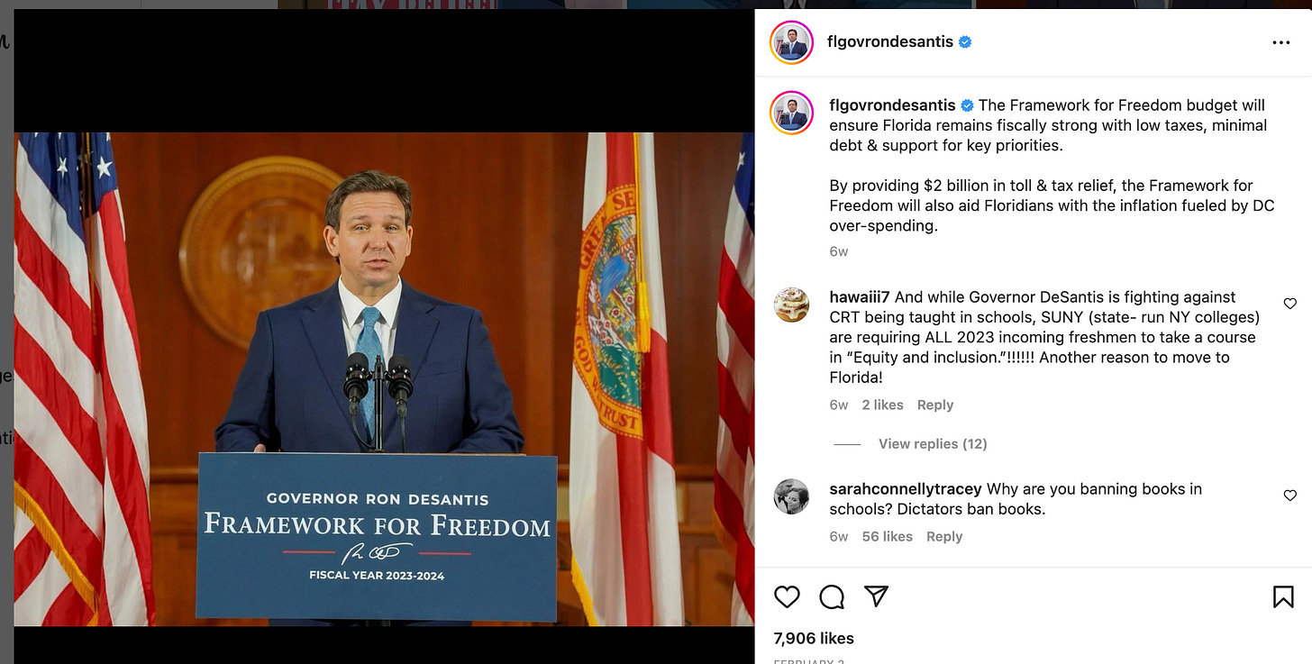 Yes I've noticed the Instagram infiltration for about a year now. I think his PR team works directly with meme guys on IG to get them to give him exposure and make him look like a tough guy. I started doing some digging and realized that DeSantis trolls are ALL OVER Instagram and they are busy gaining young people as his followers. This is a definite strategy to go after young inexperienced people who may think he's cool b/c he tries to humiliate Disney and does "tough guy stuff". You can see below his posts or posts about him just a flurry of robotic comments about how awesome he is, DeSantis is the best, DeSantis 2024 and they're typically what appear to be young people. I've been very happy to see growing counter-offensive of pages dedicated to laying out the truth on him showing up in Reels so anyone can see them.