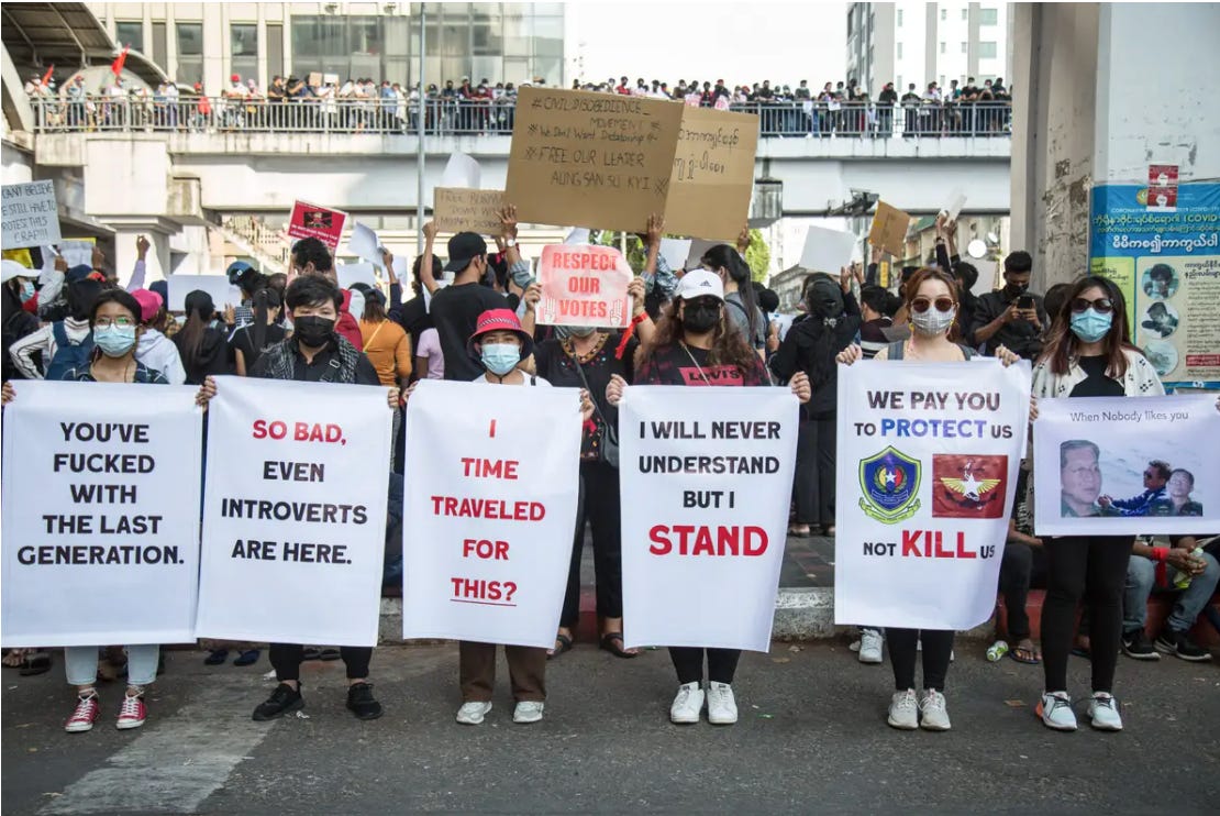 Raised with Instagram, TikTok and other platforms, they use memes and create eye-catching slogans and story lines to attract international media attention for their cause. The coup is “so bad, even introverts are here,” read one sign at a Feb. 2021 protest; “We pay you to protect us, not kill us,” read another.