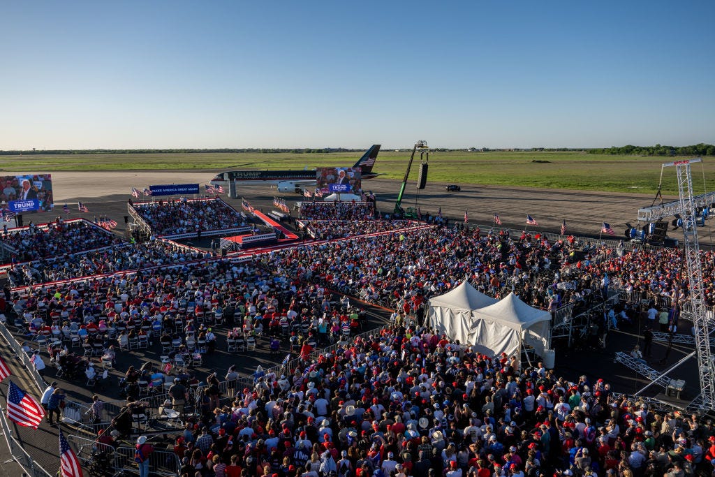 So, Trump too came down from the skies. The choice of Waco Regional airport as the rally venue was likely dictated by the desire to stage this genre of authoritarian spectacle. The crowd, there since early morning, grew excited every time a helicopter or aircraft appeared on the horizon.