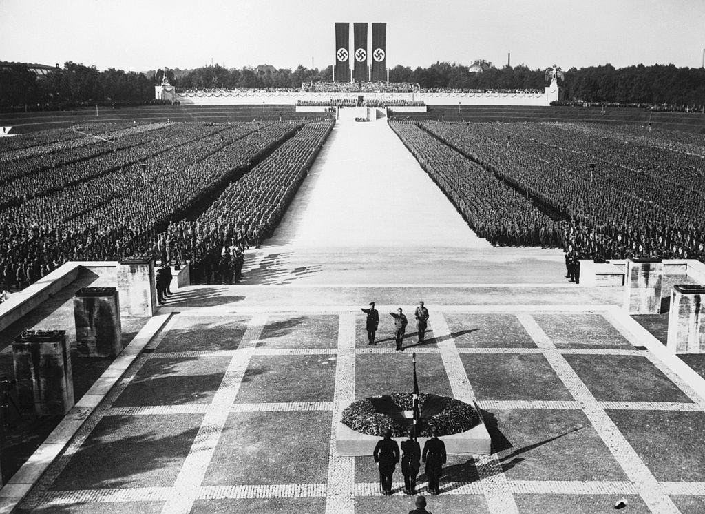 These scenes describe former President Donald Trump's recent rally in Waco, Texas, which kicked off his 2024 campaign to return to the White House. They are also among the most famous moments of Adolf Hitler’s Sept. 1934 Nazi party rally in Nuremberg, which was the subject of Leni Riefenstahl's 1935 documentary Triumph of the Will.