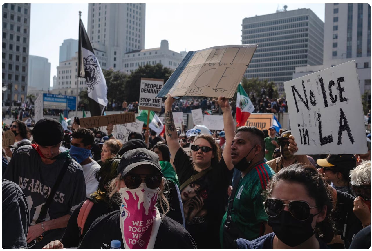 Behind the wildly disproportionate government response to these scattered local protests, and the insistence on mobilizing federal forces to Los Angeles (the LAPD stated it was equipped to handle them) is President Trump’s attempt to assert executive authority over states and cities run by Democrats he sees as political enemies. A judge blocked the Trump administration from deploying the National Guard, ordering return of authority over the Guard to California Governor Gavin Newsom, but an appeals court ruling a few hours later put that return on hold.