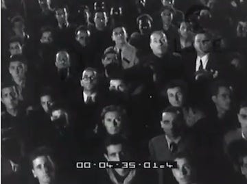 The second image is a frame enlargement from a pan of the crowd. While the newsreel released to the public had a cheering soundtrack, the closed mouths and expressions of these members of the crowd suggest silence, at least while the regime’s cameras were filming them.