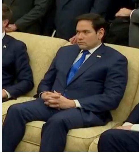 In fact, after his moody performance ended, Rubio sprang into action to debase himself further, praising Trump’s open prioritizing of Putin’s aims in Ukraine as patriotic: “Thank you @POTUS for standing up for America in a way that no President has ever had the courage to do before,” was his take.