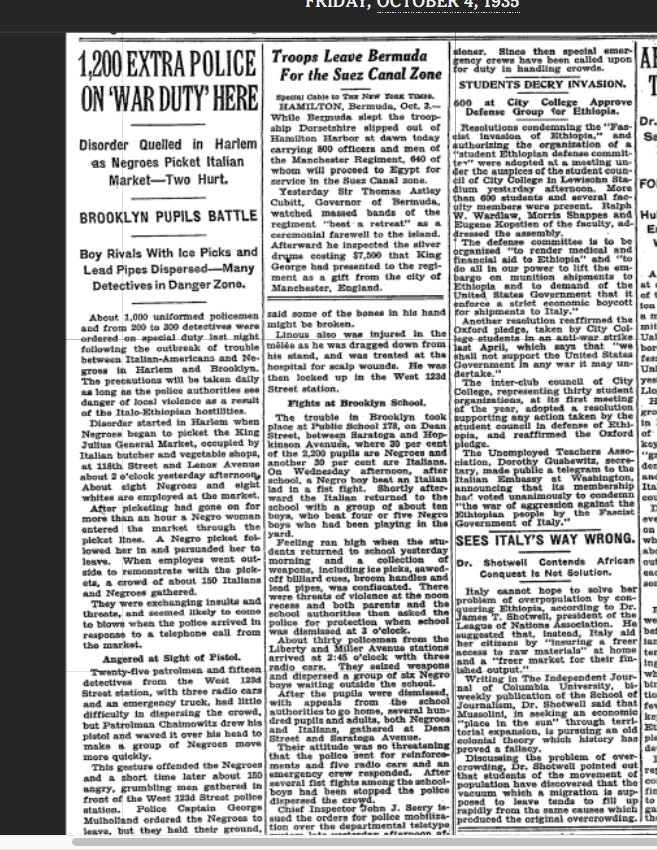 In fact, while some Italian-Americans in New York protested Mussolini, others embraced him. When the invasion of Ethiopia began on Oct. 3, Italian-American and Black students brawled at Brooklyn’s P.S. 178, and a Black protest of Italian vendors at the King Julius General Market on Lenox and 118th Street turned into a riot. The New York City Police Department deployed 1,200 extra policemen on “war duty” to address the unrest.