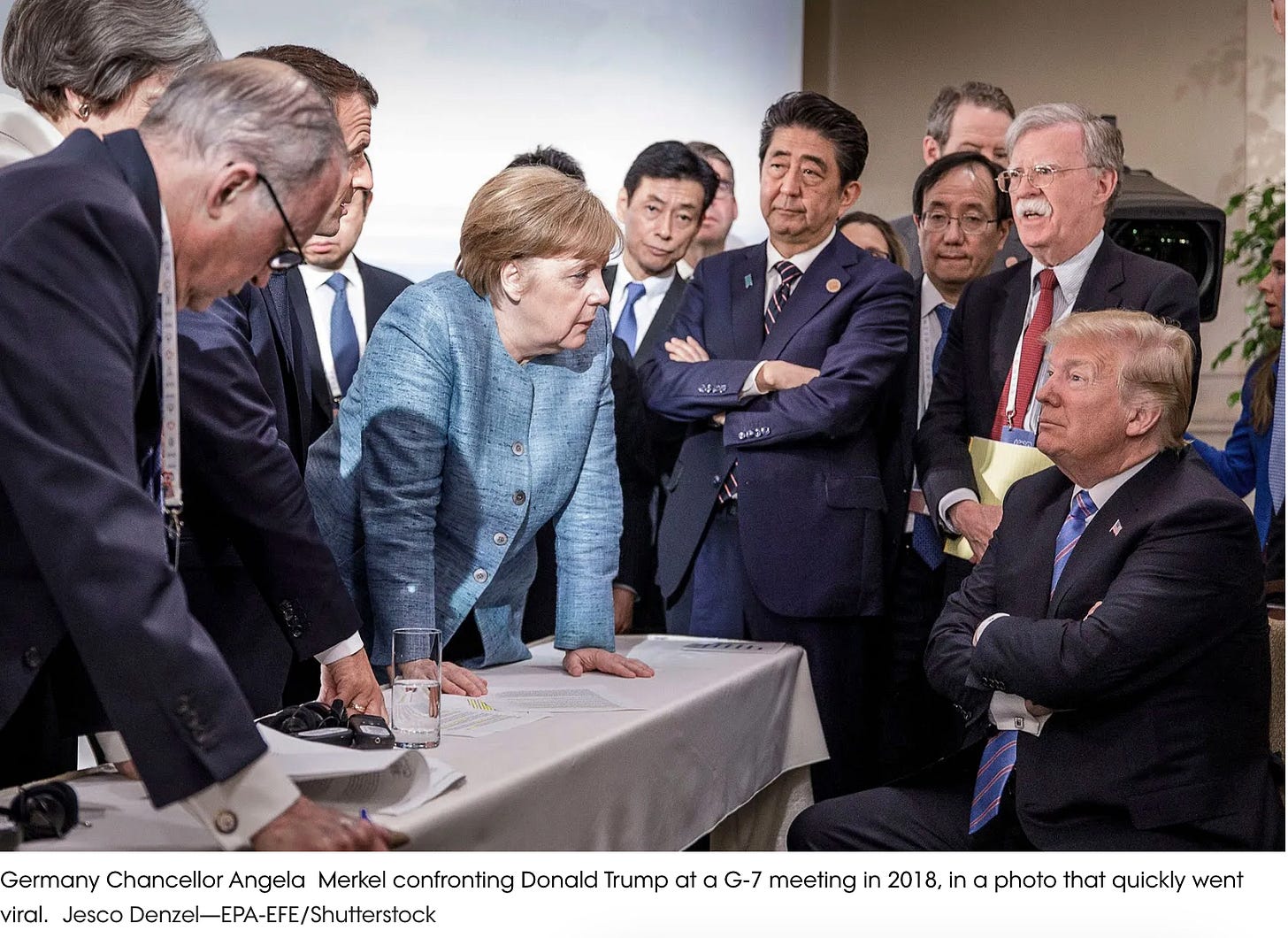 Trump's rudeness continued in subsequent official phone calls, including one during which he called Merkel "stupid." At the G7 conference in 2018, with little patience left for Trump's destructive stances on NATO and climate change, Merkel confronted Trump, sending him into full infantile belligerent-denial mode (note the pout, the glare, and the crossed arms). Merkel's assertive body language is all the more notable next to that of the male world leaders around her, some of whom were also exasperated but did not confront Trump verbally or otherwise.